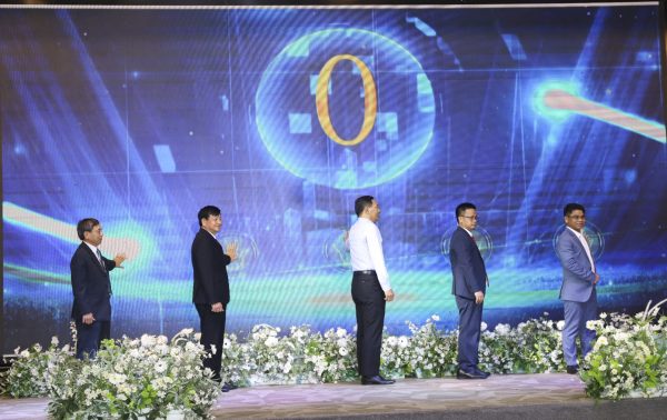 Các đại biểu thực hiện nghi thức ra mắt app check quy hoạch bất động sản Khánh Hòa.